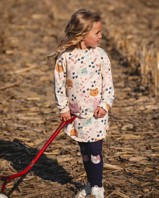 Glittering French Terry Dress Beige Printed Cat